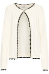 Don't you love a classic look? This beautiful knit cardigan has a cream coloured body and scalloped black edging on the neck, sleeves and waist. This is a perfect top to wear with jeans for a casual look, but would be perfect with a dressy black pant! If you want to add to the look, pair it with the matching short sleeve top.